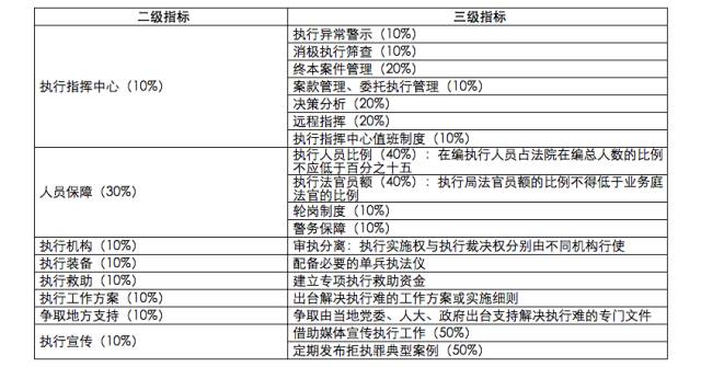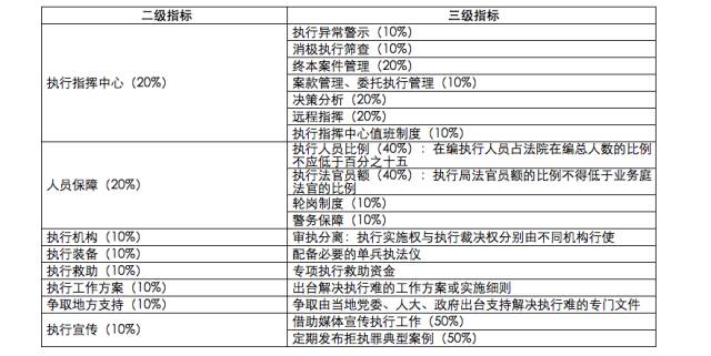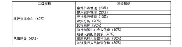 最高人民法院的执行保障指标包括执行指挥中心和人员配备两个方面。执行指挥中心重点考察案件节点管理、终本案件管理、委托执行管理、决策分析、远程指挥等功能。人员配置指标强调执行人员配备要达标、警务保障要充足,优化执行人员结构,强化执行人员的日常业务培训。高级人民法院的执行保障除了评估执行指挥中心和人员保障之外,还评估执行大格局、执行救助和执行宣传等指标。