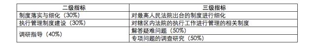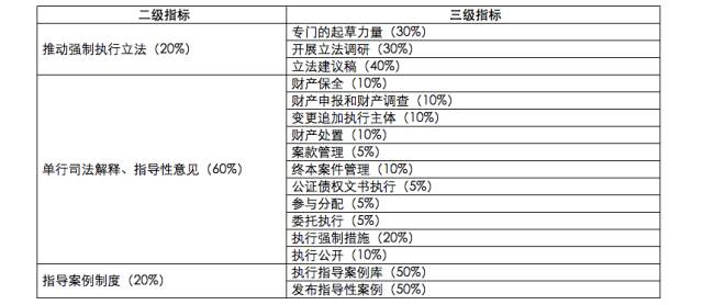 最高人民法院的制度建设指标主要考察最高人民法院是否建立较为完善的执行制度体系,包括推动强制执行立法的情况、制定单行司法解释和指导性意见的情况以及建立指导性案例制度的情况。对于高级人民法院而言,该部分指标主要强调三个方面:一是对最高人民法院出台的制度进行细化;二是对辖区内法院的执行工作制定管理文件;三是调研指导,包括解答疑难问题以及针对专项问题进行调查研究。