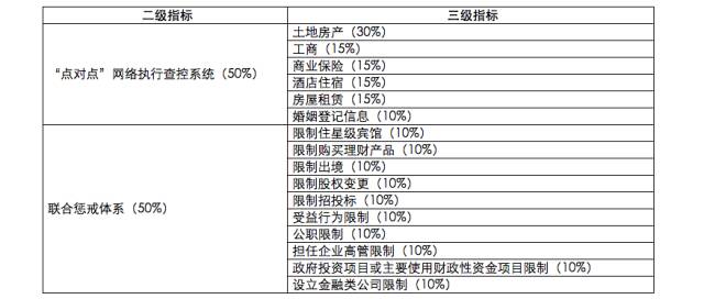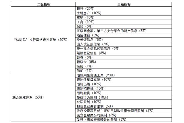 执行联动包括网络执行查控系统和联合惩戒两个方面。最高人民法院的网络执行查控系统指标主要评估最高人民法院“总对总”执行网络查控系统的完备度,例如联网了多少金融机构,能否实现网上冻结和扣划银行存款,以及是否与相关部门的数据对接进行联网查询。最高人民法院的联合惩戒指标主要评估最高人民法院通过与相关部门协助实现对失信被执行人的惩戒,如与工商、金融、公安、交通等部门联网限制被执行人乘坐特定交通工具、限制住星级宾馆、限制出境、限制招投标、限制融资、限制购买商业保险等。联合惩戒还包括实现对被执行人的受益行为实行失信一票否决制。高级人民法院的执行联动对于最高人民法院而言主要起补充作用。