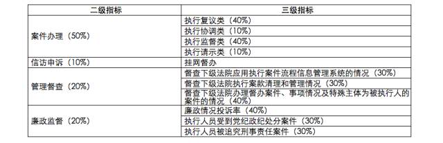 中级人民法院与基层人民法院都办理执行实施类案件,因此两者的指标体系相似,在规范执行、阳光执行、执行质效和执行保障四个一级指标上是重合的,不同之处在于中级人民法院比基层人民法院多了一个监督管理一级指标。