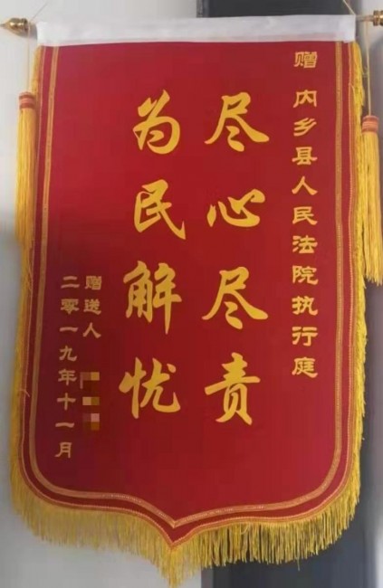 “秦法官,这十几万的欠款我们要了十年都没有要到,多亏您从中工作,您为我们帮了大忙,我们发自内心的感激您!”11月15日下午,一名当事人来到河南省南阳市内乡县人民法院,将一面写着“尽心尽责 为民解忧”的锦旗送到执行法官秦峻潭手中,并高兴地连连道谢。