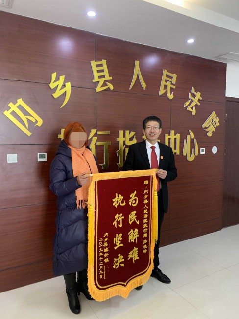 12月9日,申请执行人张某来到内乡县人民法院执行局,将一面上书“为民解难,执行坚决”的锦旗送到执行法官孙晓峰手上。锦旗上的八个大字不仅表达了申请人的感激之情,更加体现了其对执行法官兢兢业业工作的肯定与赞扬。