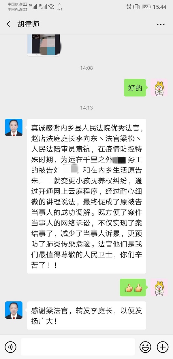 庭后,原告代理人胡律师谈及庭审体验时连连“点赞”,“通过开通网上云庭程序,方便了当事人的诉讼,不仅实现了案结事了,减少了当事人诉累,更预防了肺炎传染危险。真诚感谢你们,你们是我们最值得尊敬的人民卫士!”