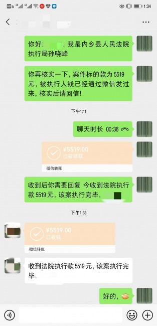 案件进入执行程序后,考虑到目前是抗击新冠肺炎的关键时期,执行法官转变执行思路,电话联系被执行人,耐心释法析理,向其阐明拒不履行法律义务的严重后果,并告知其成为失信被执行人将受到的惩罚和限制。经过与被执行人推心置腹、入情入理的沟通交流,李某表示愿意支付剩余赔偿款,并通过微信转账的形式将赔偿款支付给执行法官,执行法官也第一时间通过微信将赔偿款转账给刘某。至此,一起可能因疫情防控拖延执行兑现的案件顺利执结。