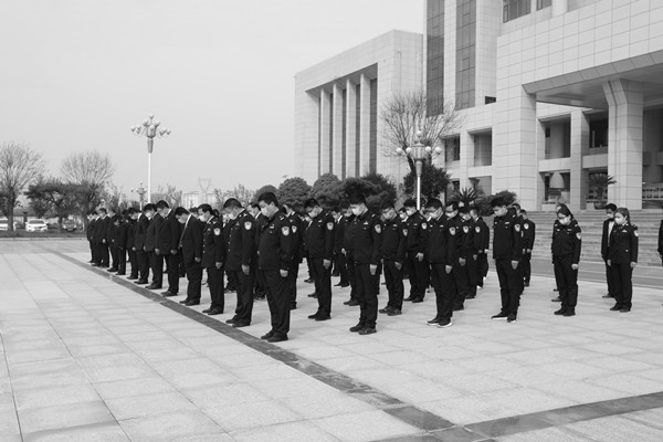 上午10时,伴随着防空警报和警车的鸣笛声,该院干警代表集体肃立默哀3分钟。