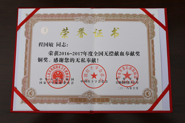 6月14日,在第17个世界献血者日到来之际,河南省内乡县人民法院湍东法庭干警程国敏因长期坚持无偿献血,荣获由国家卫生健康委员会、中国红十字会总会、中央军委后勤保障部卫生局联合颁发的2016-2017年度全国无偿献血奉献奖铜奖。