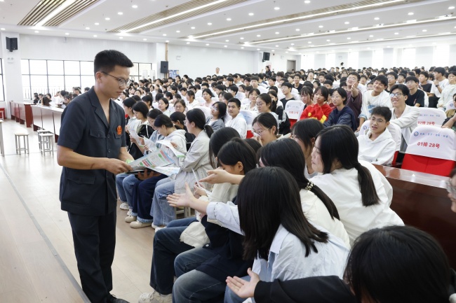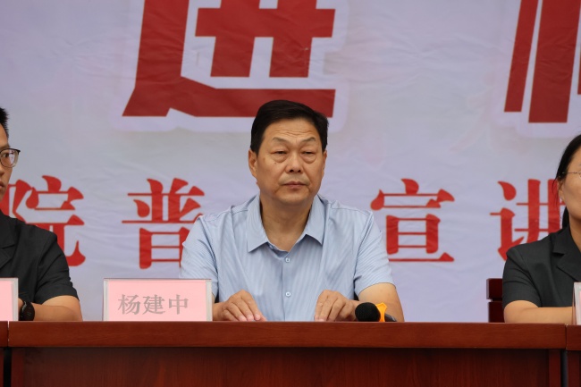 随后,内乡县教体局党委委员杨建中发言。他表示,此次送法进校园活动,既是新学期的“法治第一课”,也是为同学们撑起“平安伞”、点亮“规则灯”。他围绕“知法于心、守法于行、传法于众”三方面与师生交流,并强调,法治是青春的“护身符”,法律并非冰冷条文,而是保护少年的铠甲,与日常行为息息相关;提醒同学们守法是成长的“安全带”,要对欺凌、诱惑、侥幸说“不”,遵守校规与法律,避免因一时糊涂触碰红线;鼓励同学们做平安的“守护者”,以点滴行动传播法治知识,为校园安全添砖加瓦。最后,他寄语同学们:“法律不是束缚自由的锁链,而是托举梦想的翅膀,愿大家在法治土壤中拔节生长,在规则天空下自信翱翔。”